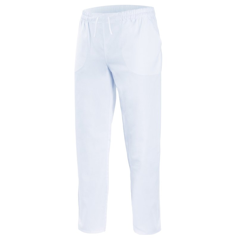Pantalón con goma elástica en el interior de la cinturilla y cinta para ajustar. Dos bolsillos franceses. Sarga. 65% poliéster – 35% algodón. Gramaje 190 gr/m2.